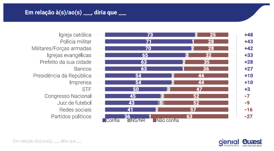 A mais recente pesquisa Genial/Quaest mostra que há larga diferença na confiança que o brasileiro deposita em instituições como a igreja e polícias militares, de um lado, e partidos políticos, Congresso Nacional e Supremo Tribunal Federal, de outro. Enquanto que 73% da população diz confiar na Igreja católica, por exemplo, apenas 36% confia em partidos, uma diferença de 37 pontos percentuais.
