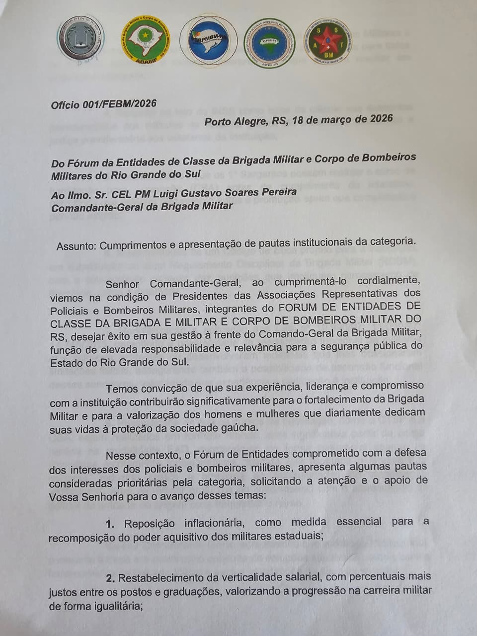 Na manhã desta quarta-feira (18/03/26), o Fórum de Entidades Representativas dos Policiais e Bombeiros Militares do Rio Grande do Sul (composto por ABAMF, AOFERGS, ASSTBM, FERPM e ASPRA) participou de uma importante reunião com o Comandante-Geral da Brigada Militar, Coronel Luigi, o Subcomandante, Coronel Dirceu, e o Chefe do Estado-Maior, Coronel Martinelli.