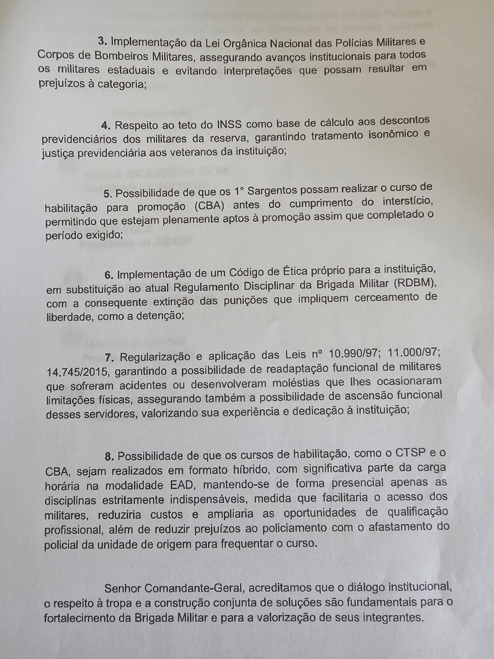 Durante o encontro, foi entregue um ofício contendo pautas prioritárias da categoria, construídas a partir das necessidades reais vivenciadas no dia a dia das atividades policiais e de bombeiro militar.